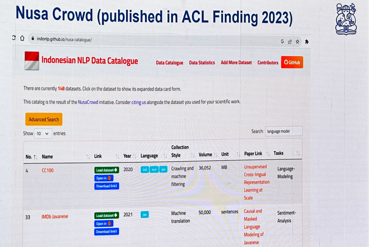 NusaCrowd is an Indonesian NLP Data Catalogue consolidating over 200 datasets.