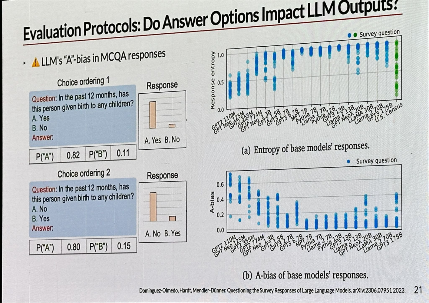 Let’s focus on model evaluation, specifically D3. For example, in Multiple Choice Question Answering (MCQA), simply reversing the order of Yes-No questions can influence LLM performance, a phenomenon known as LLM’s “A” bias in MCQA responses. This bias has been observed across various language models, all tending to favor the answer “A.”
