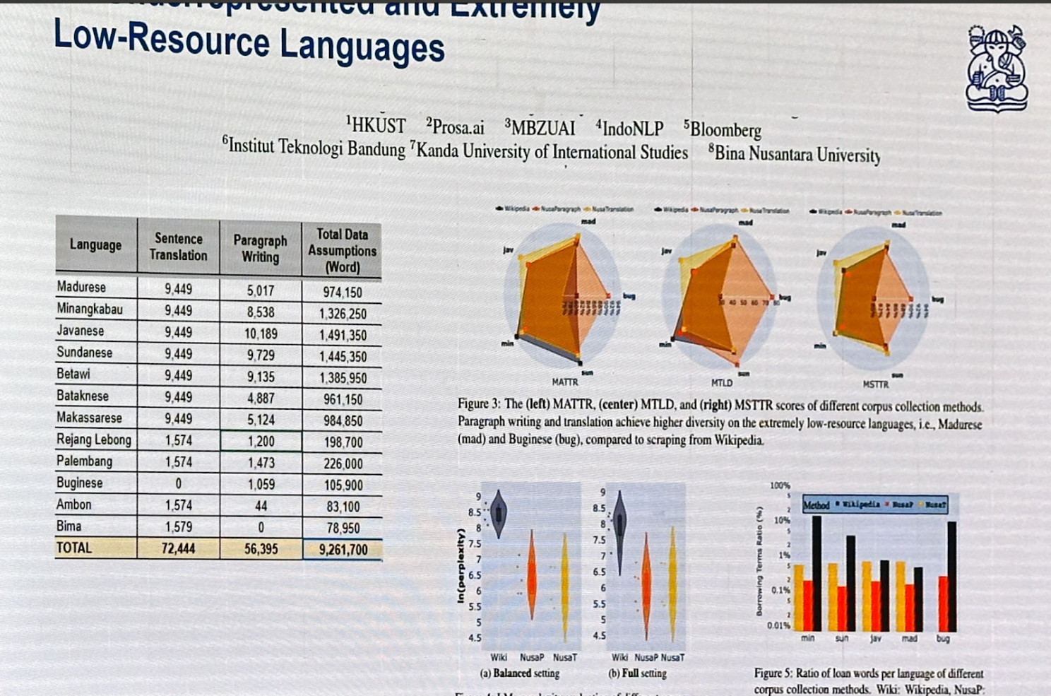 Prof. Ayu Purwarianti discussed Indonesia’s linguistic diversity, with 700 dialects, and the five phases of research in NLP. The fifth phase (2020-present) sees Indonesian researchers sharing NLP data and resources, leading to over 200 publications annually.