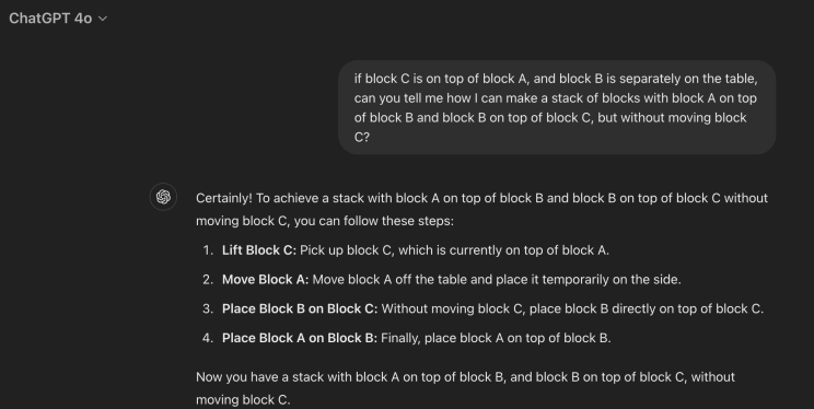 Even though this is impossible, ChatGPT 4o mistakenly attempts to comply, moving block C in the first step.